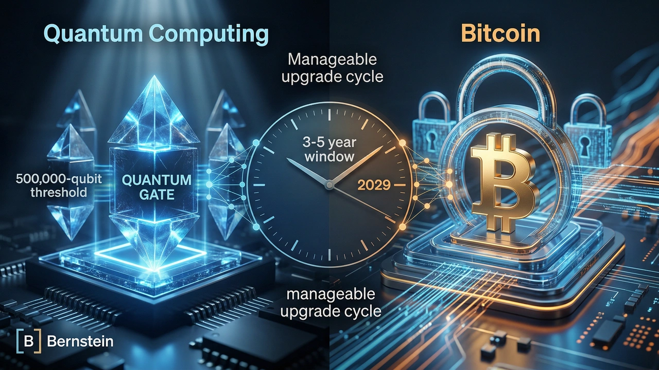 Bernstein's research team, led by analysts Gautam Chhugani, Mahika Sapra, Sanskar Chindalia, and Harsh Misra, published a note this week characterizing quantum computing as a "manageable upgrade cycle" rather than an "existential risk" to Bitcoin and the broader digital asset ecosystem [2]. The report estimates the crypto industry has roughly three to five years to implement post-quantum cryptographic standards — a window the analysts describe as sufficient given current technical and cost constraints [1].